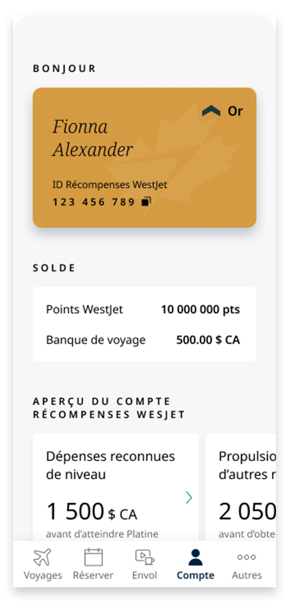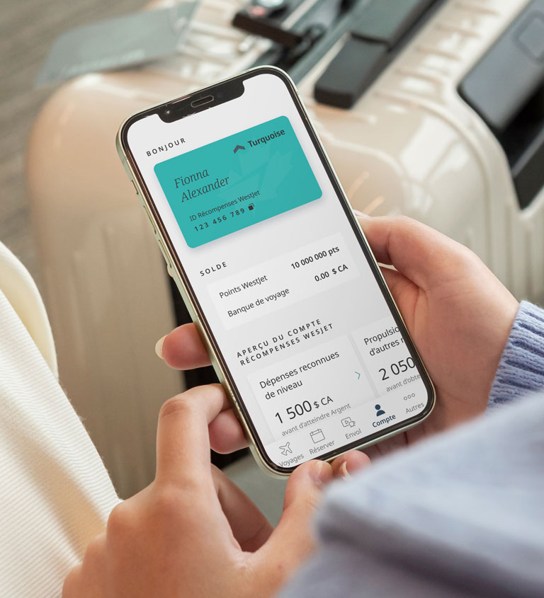 Vérifiez votre solde de Récompenses WestJet, votre statut de niveau et les bons disponibles en un coup d’œil.
